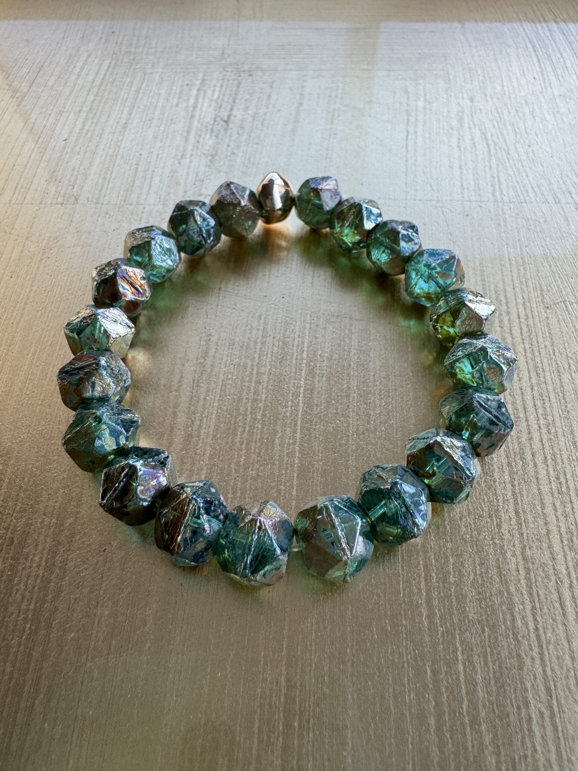 Beautiful gold-green beads give this bracelet a natural, grounded elegance. Finished with a stunning gold lovely.