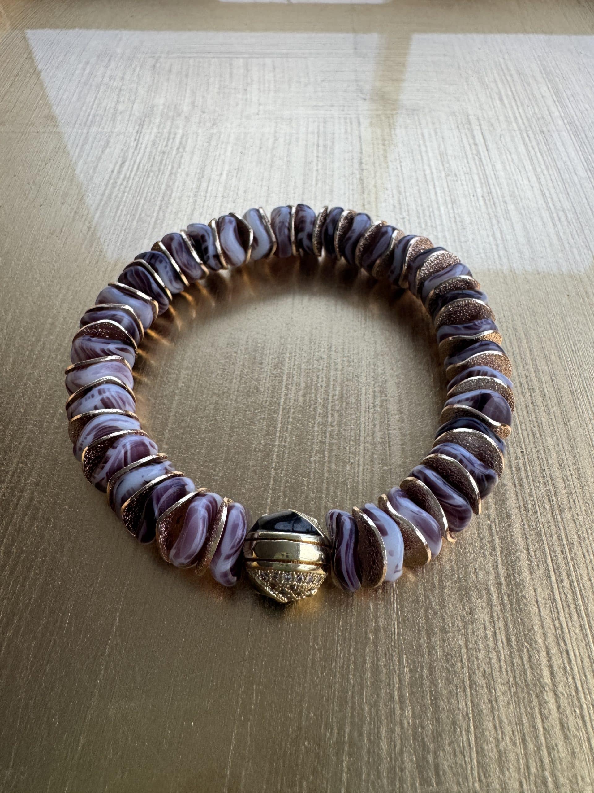 Beautiful rondelle beads marbled with a fresh mix of purple and white. The gold-black centerpiece represents the yin-yang duality. A dainty, yet attractive piece!