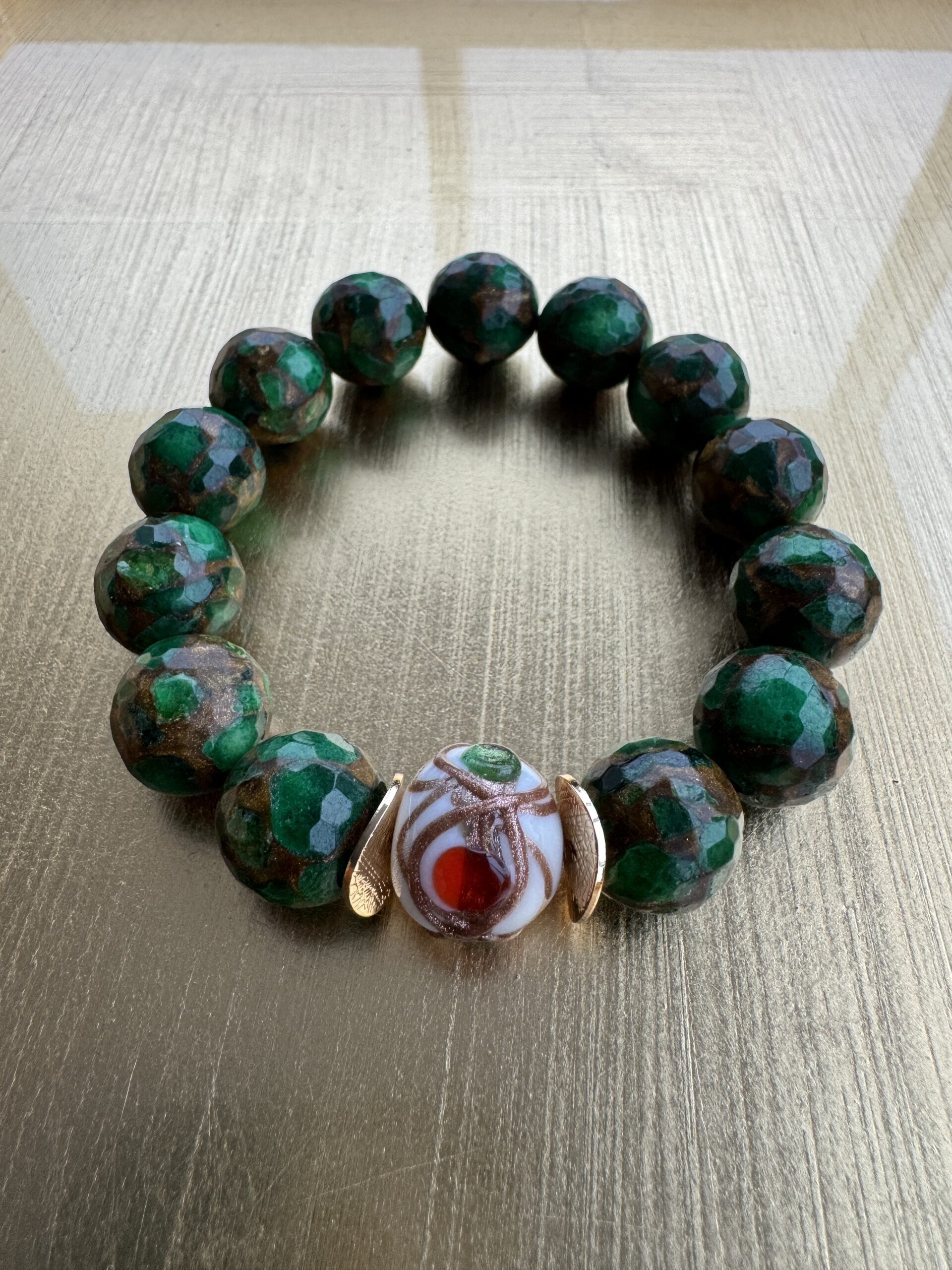 Dive into the ocean of style with this green marbled bead bracelet showcasing a handcrafted central bead with gold accents.