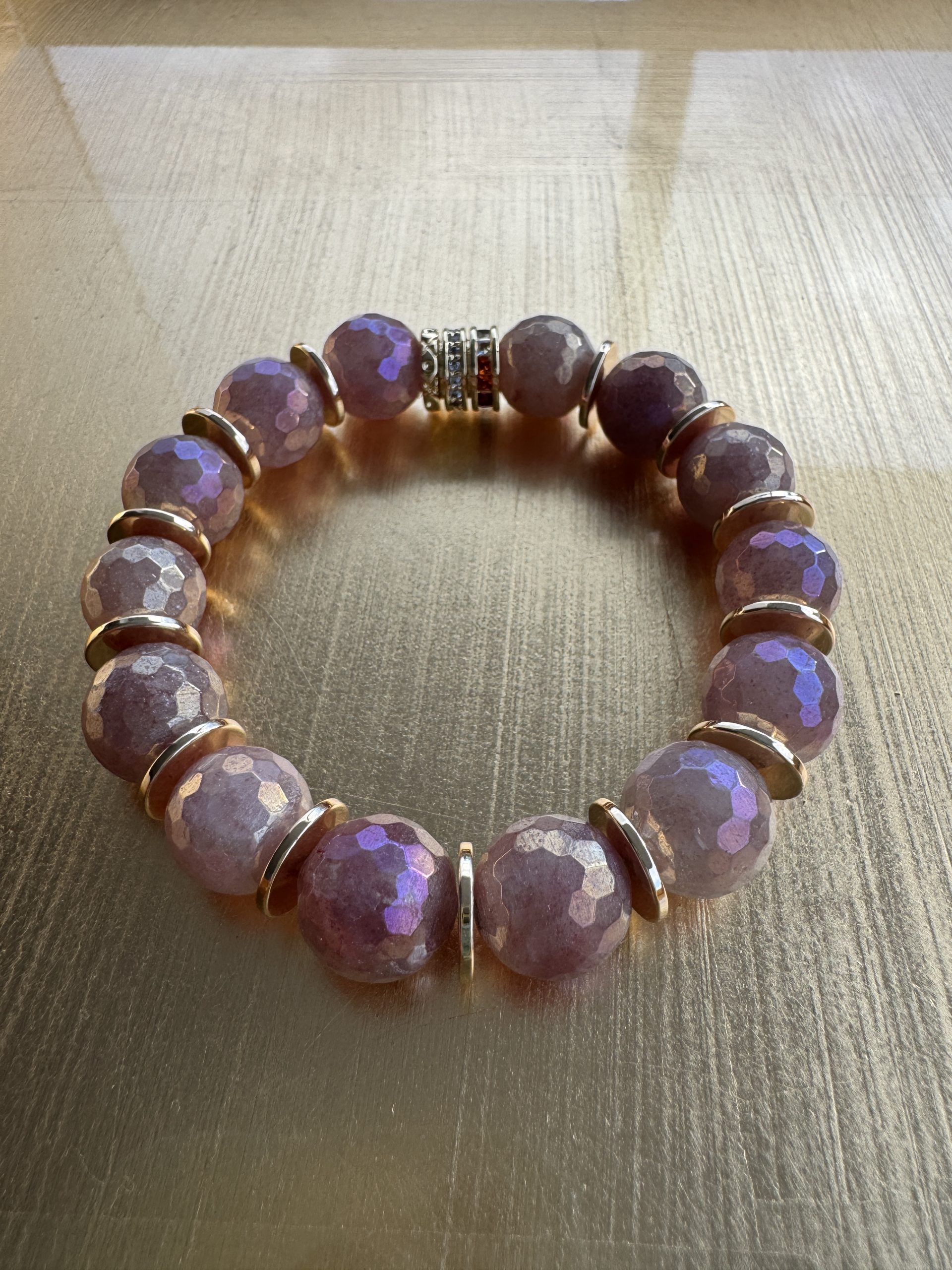 Shiny faceted pink-lilac gemstones accented with gold are a gentle reminder of a moonlit night. The gold bead is the center of interest which makes the handmade piece extremely attractive to the naked eye.
