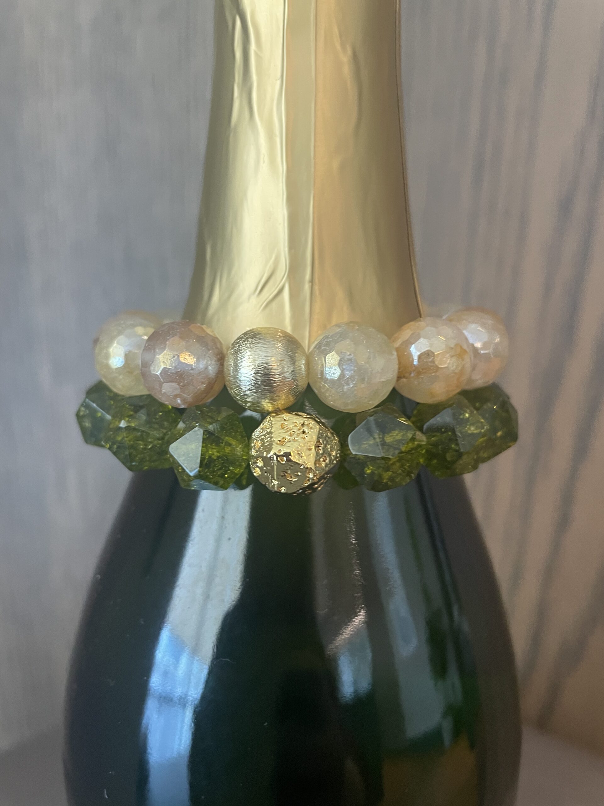 Our Peridot Oasis stacker set is a celebration of iridescence, designed to make your spirits shine with an ethereal light. The gemstones have an unconventional cut on their surfaces that shine beautifully!!