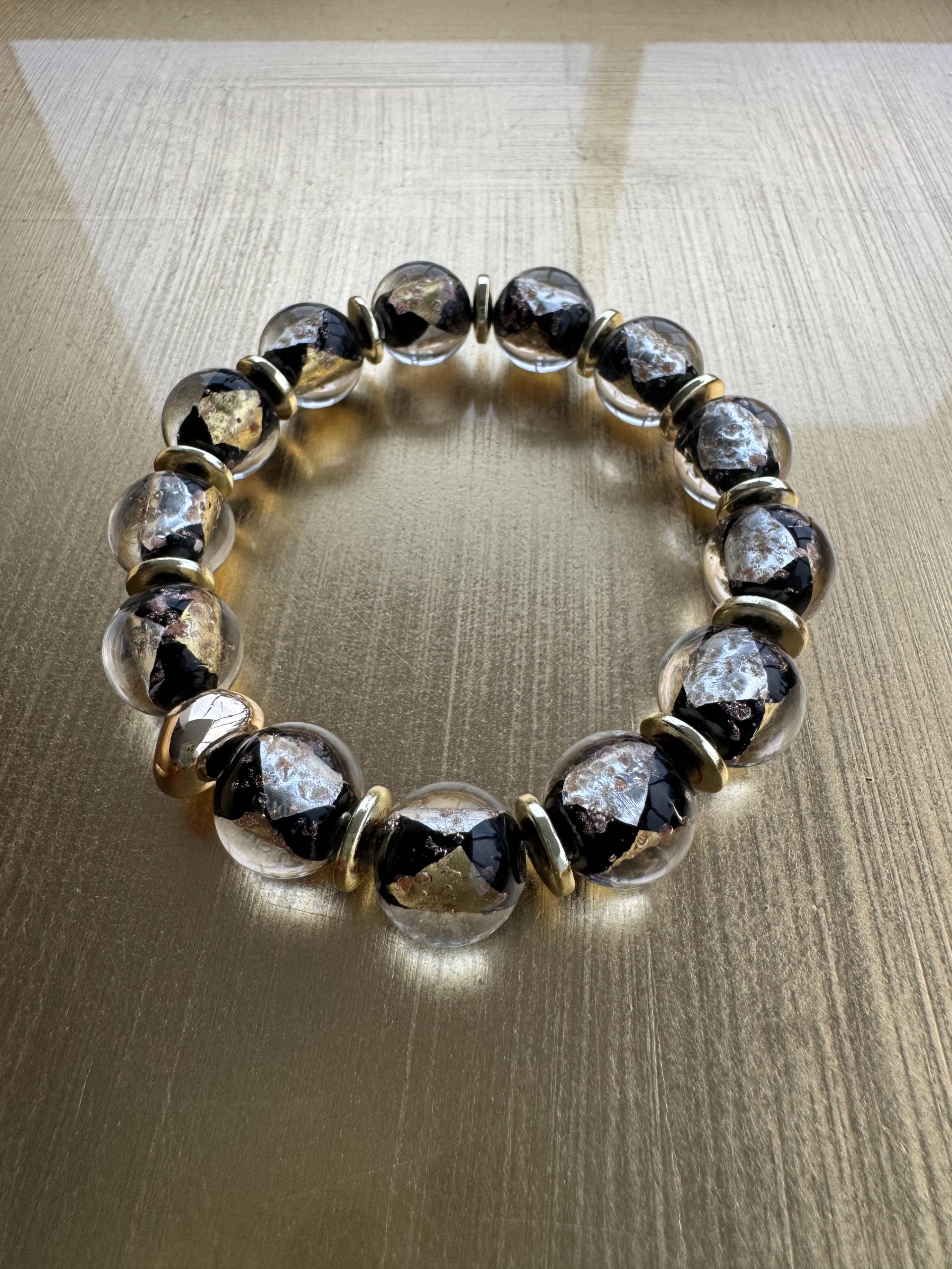 The black-gold-silver combination of Murano glass beads promise to be a radiant complement to your skin, shimmering with every movement. A vibrant choice for a special occasion.