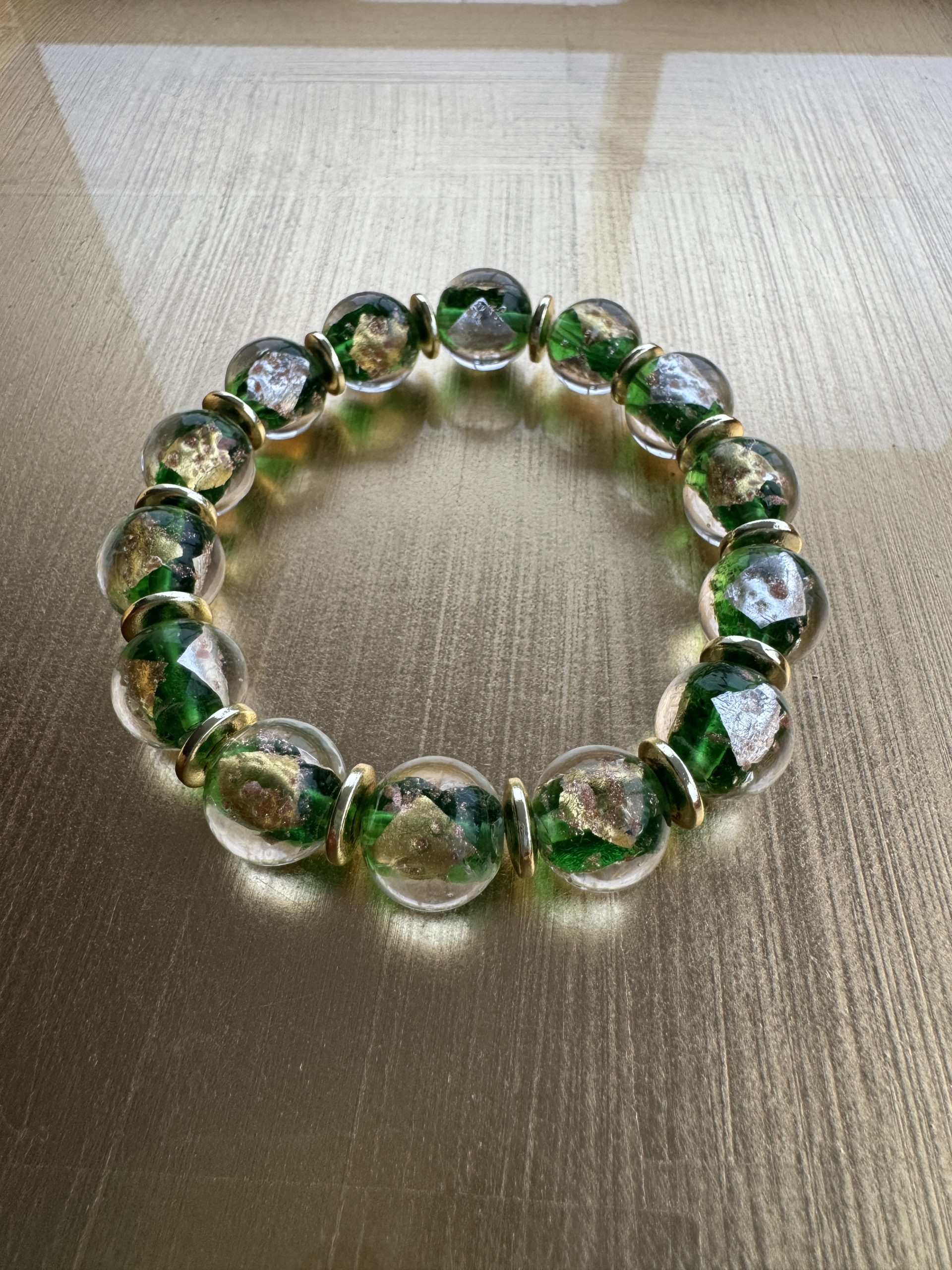 Rich green Murano glass beads paired with gold and silver foil make this bracelet a must have!!