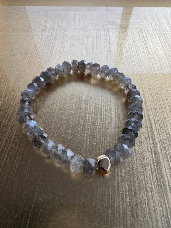 Adorn your wrist with our Sweet Surrender bracelet, where labradorite rondelle gemstones sparkle. The gold accent acts as a delicate adornment, offering a classic elegance to everyday style.