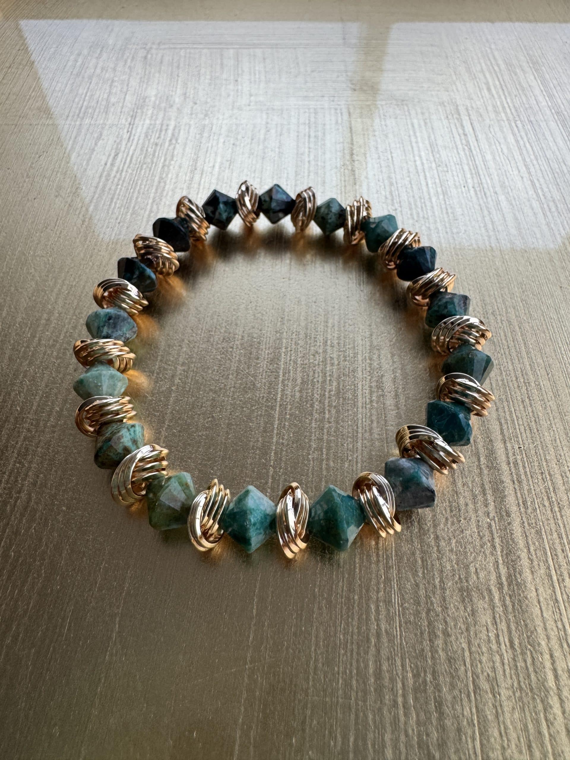 Make a statement with beads that look like planets in their orbits. This bracelet pairs green hued beads with gold spacer beads to create a truly timeless look.